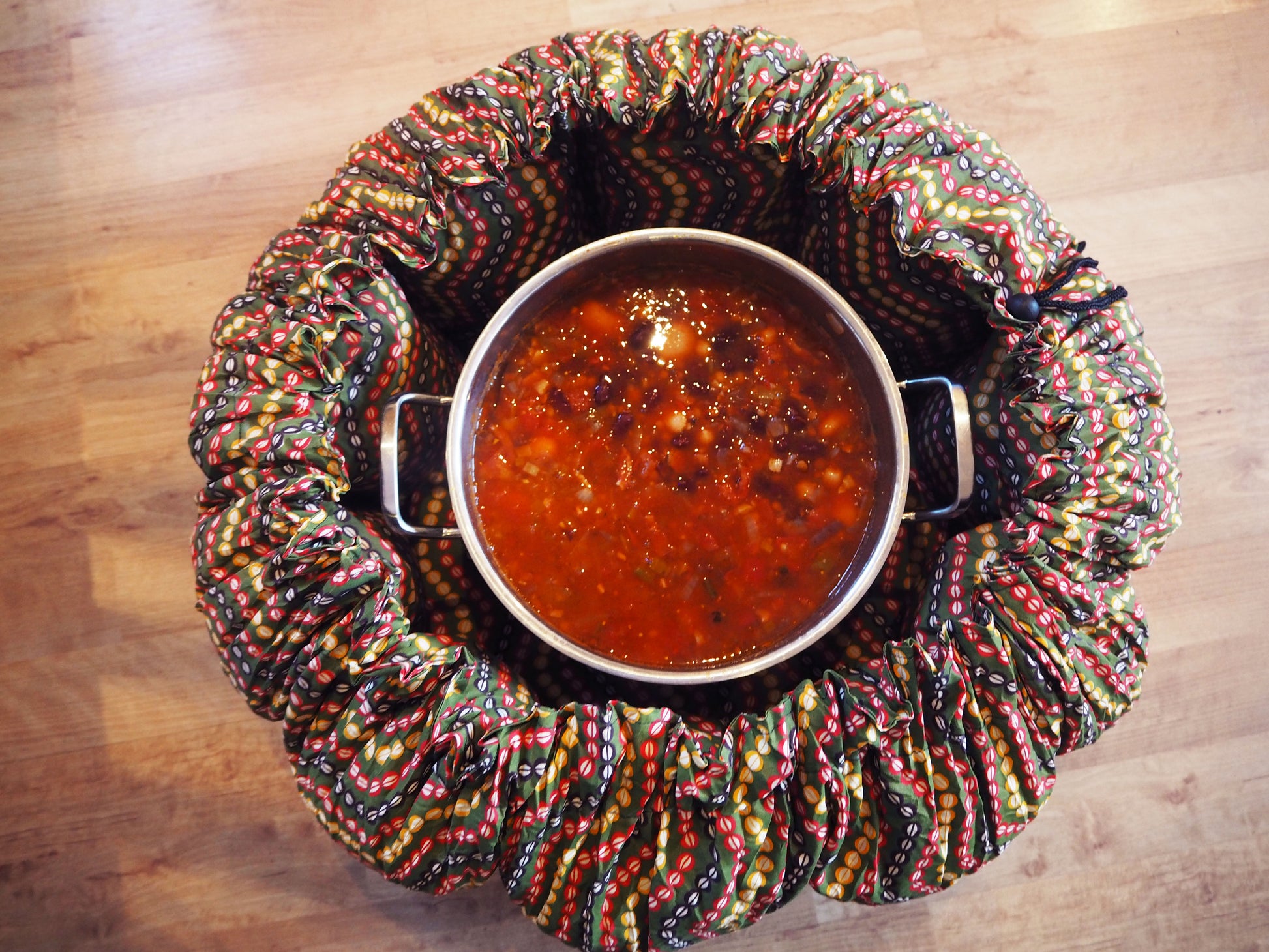 Når maten har blitt kokt opp, plasserer du gryten i Wonderbag – der den fortsetter å koke i opptil 8 timer uten strøm, brensel eller batteri.